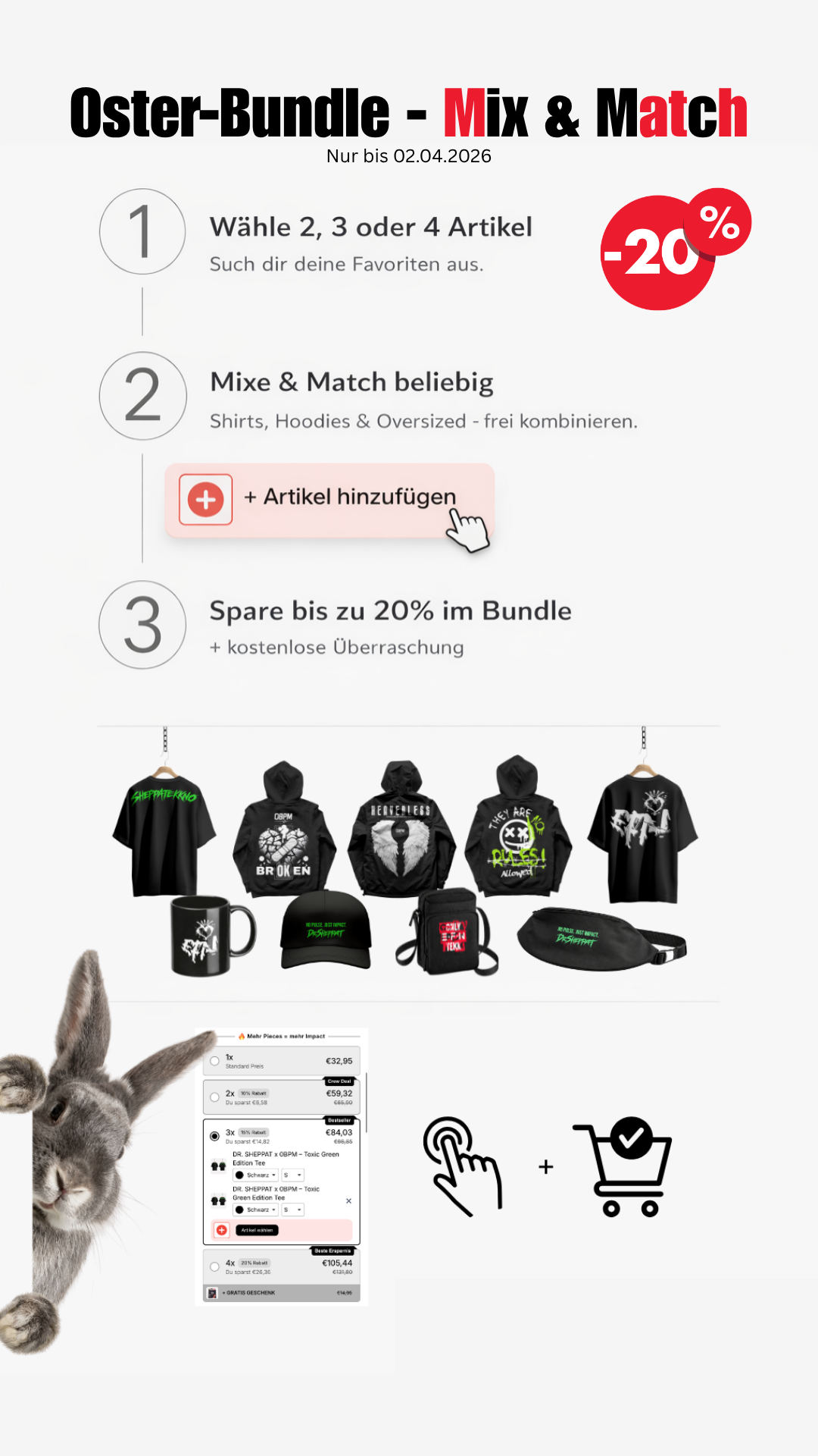 Deine Bestellung wird in 4-5 Werktagen bei dir Zuhause sein. Wir versenden mit DHL. Bei hohem Bestellaufkommen (z. B. Drop-Releases, Black Friday, Weihnachten) kann sich die Bearbeitungszeit leicht verlängern.